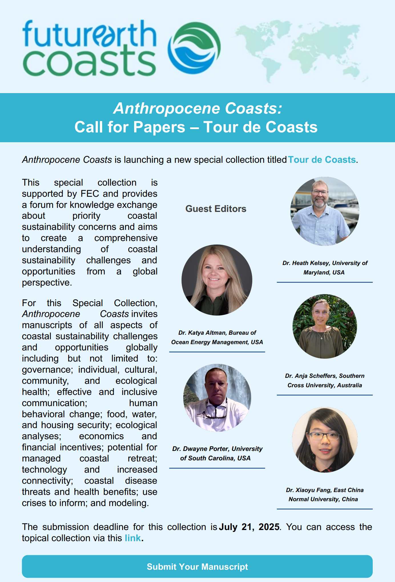 It has long been the goal to begin meaningful knowledge exchange among the global network of Future Earth Coasts (FEC) affiliated researchers and practitioners, and communities engaged with them. These partners have unique understandings of coastal sustainability issues reflective of a variety of coastal system types, geographies, and socio-economic realities. This special collection is supported by FEC and provides a forum for knowledge exchange about priority coastal sustainability concerns and aims to create a comprehensive understanding of coastal sustainability challenges and opportunities from a global perspective.