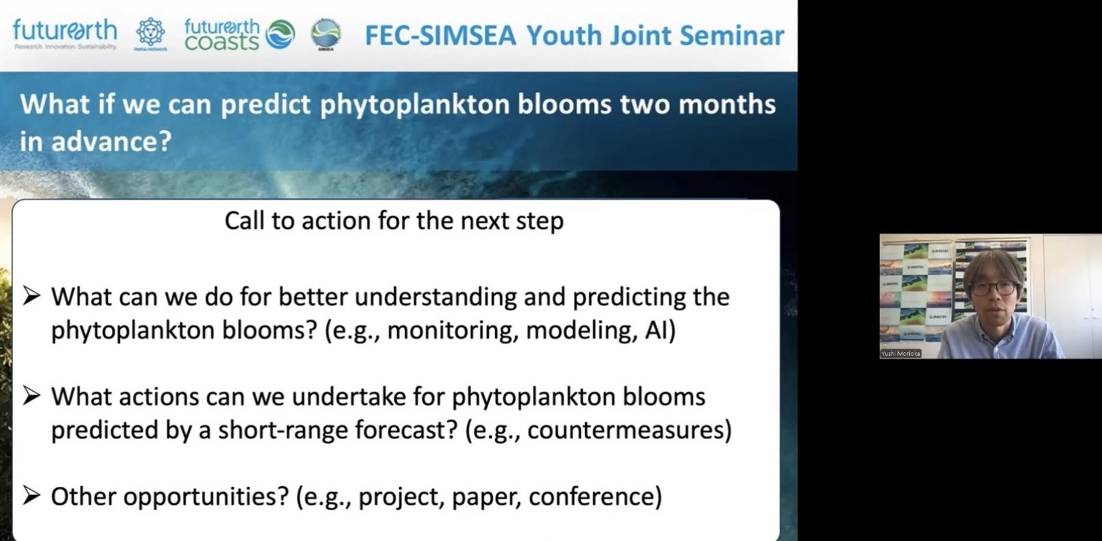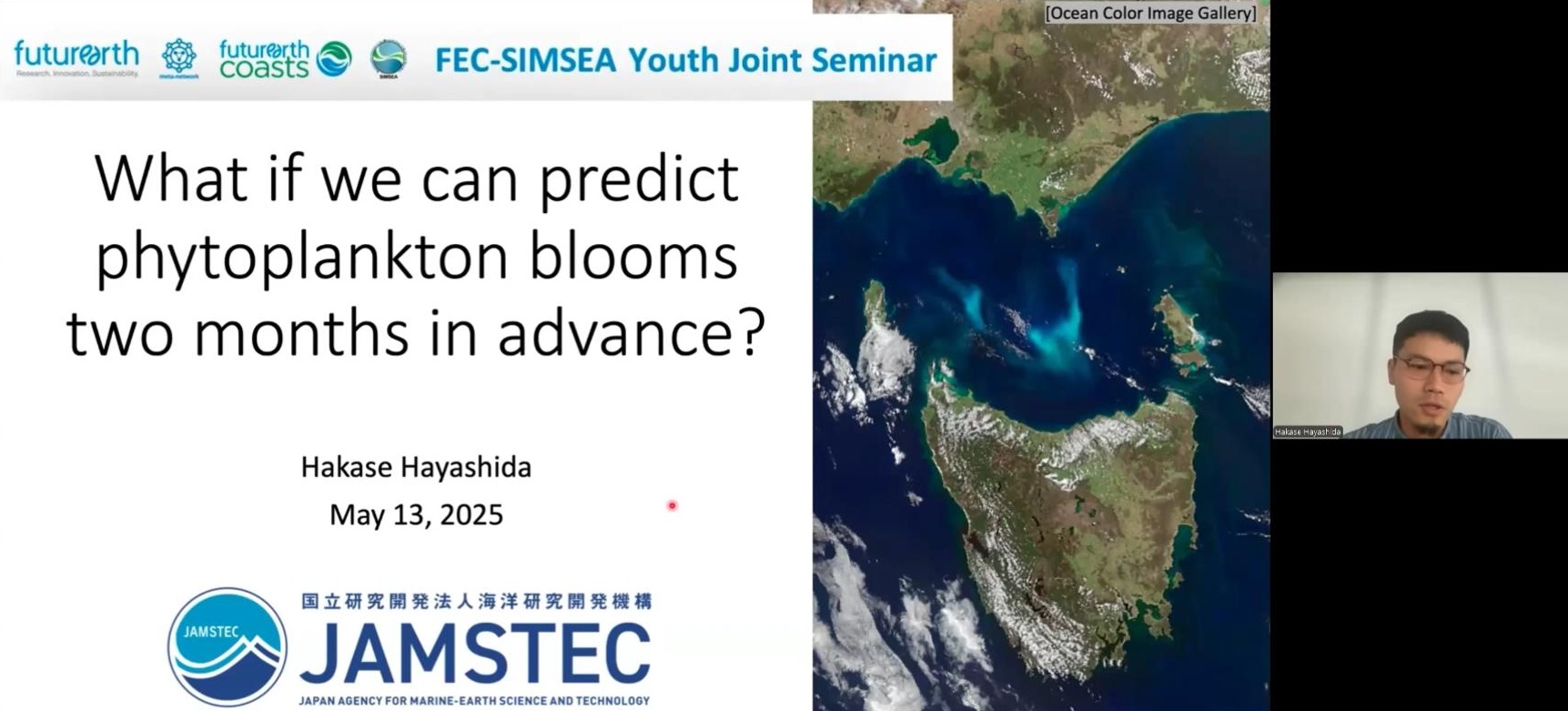 On May 13, 2025, the FEC-SIMSEA youth joint seminar featured Dr. Hakase Hayashida from JAMSTEC, who delivered an insightful presentation on the potential for short-range forecasting of phytoplankton blooms using operational ocean models. As part of the Future Earth Coasts and SIMSEA Meta-Network youth seminar series, this session spotlighted cutting-edge efforts to integrate marine biogeochemistry into ocean prediction systems.