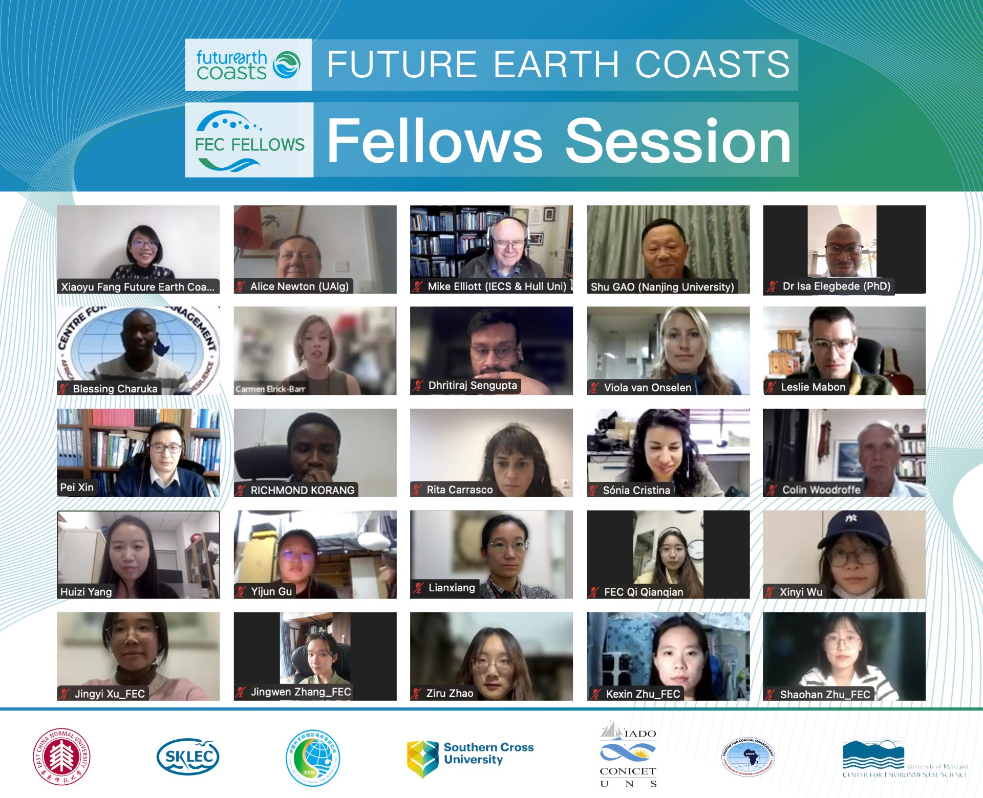 At the end of this session, Prof. Alice Newton, Prof. Mike Elliott, and Prof. Shu Gao from FEC gave their concluding remarks in turn. Alice was very happy to see that FEC Early Career Researchers have great enthusiasm for their research field, and their research outcomes were impressive; In addition, FEC aims to provide all researchers with platforms and channels for communication and cooperation. Mike pointed out that attention needs to be paid to discoveries and progresses in other parts of the world. He emphasized that learning these excellent works would help broaden minds. Shu was very pleased to meet new and old friends. He mentioned the complexity of the coastal system, the length of the life cycle, and coastal erosion. Then he proposed that we need to find some new approaches to adapt to future climate change and sea level rise, and new technologies should also be actively used such as artificial intelligence, machine learning, and big data analysis. He also mentioned that the development of the Mega-Delta was particularly important, and interdisciplinary research should be carried out. He also introduced the official FEC journal, Anthropocene Coasts, to participants and welcomed all to contribute.