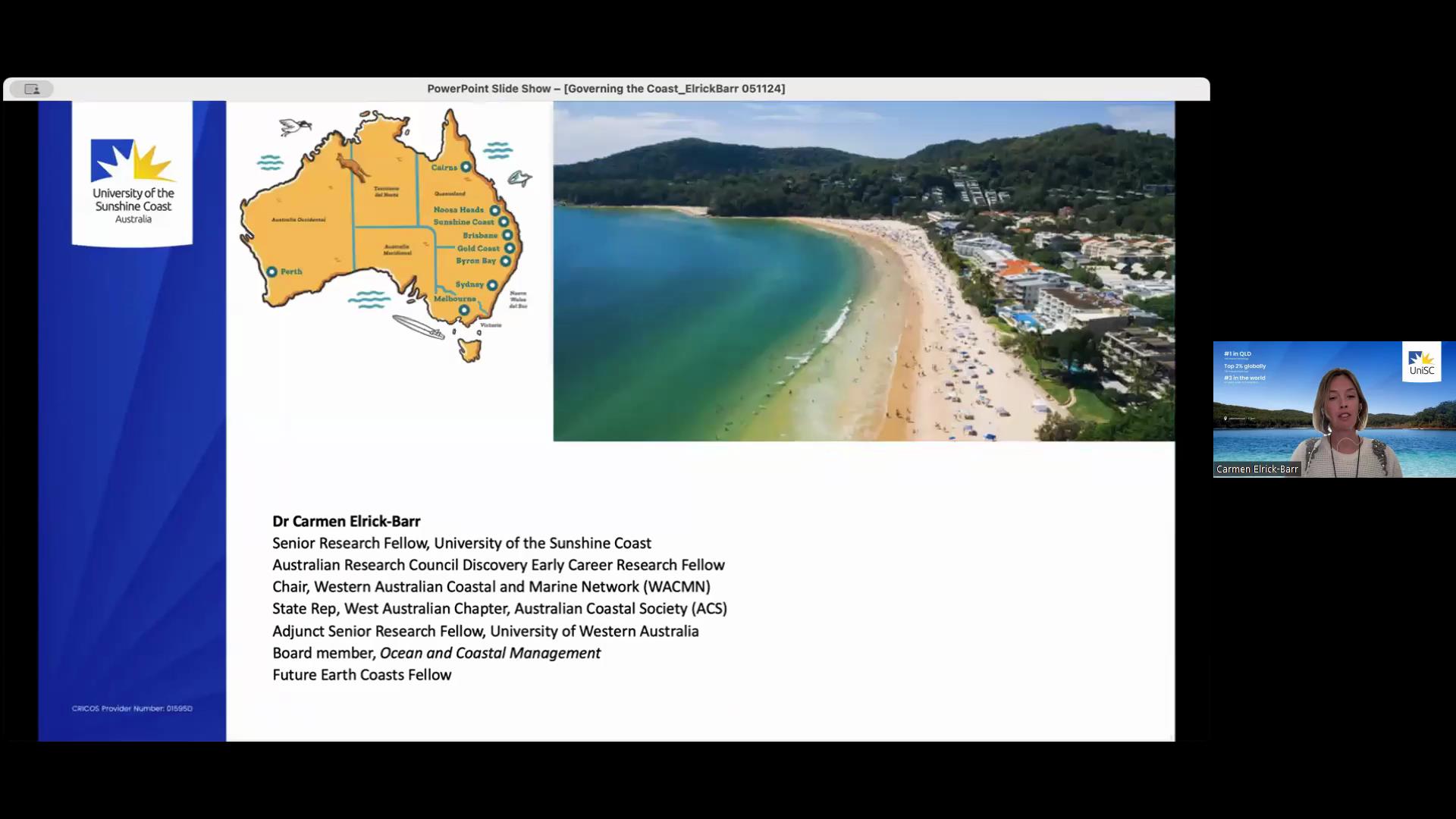 The session concluded with an interactive Q&A, where participants discussed key coastal governance issues, including resilience pathways for regions impacted by rising sea levels, extreme weather, and socio-economic shifts. Topics ranged from applying the methods in resource-limited areas to balancing economic goals with environmental preservation. Dr. Elrick-Barr emphasized early stakeholder engagement, cost-effective nature-based solutions, and collaborative governance, stressing that inclusive partnerships are key to lasting coastal sustainability.