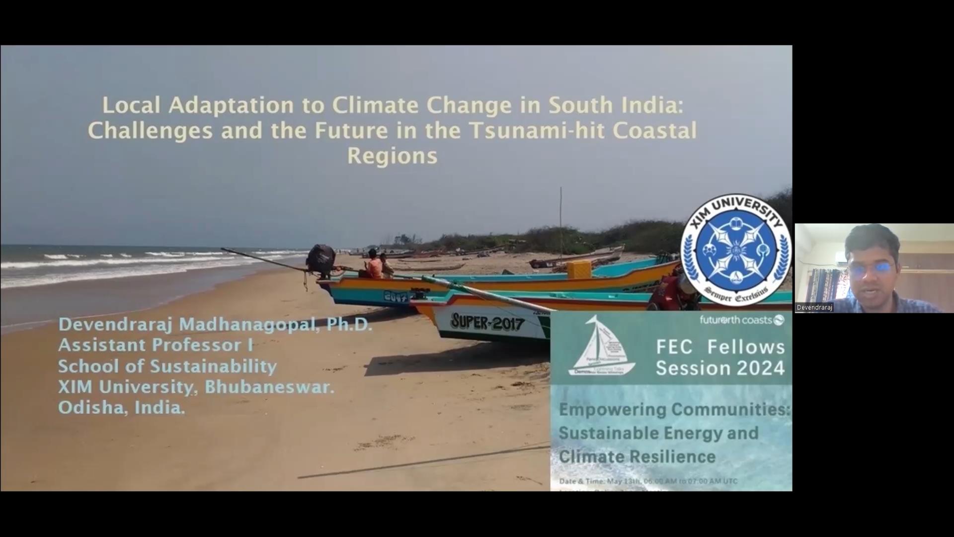 Dr. Madhanagopal’s presentation examined how traditional marine fishers in tsunami-affected South Indian coastal regions, notably the Pattinavar communities along the Coromandel Coast, adapt to climate change. He highlighted the intricate relationship between indigenous knowledge systems, sociocultural norms, and local adaptation responses to climate change. His research underscored the socio-political dimensions of adaptation and offered valuable insights applicable beyond the Indian shores.