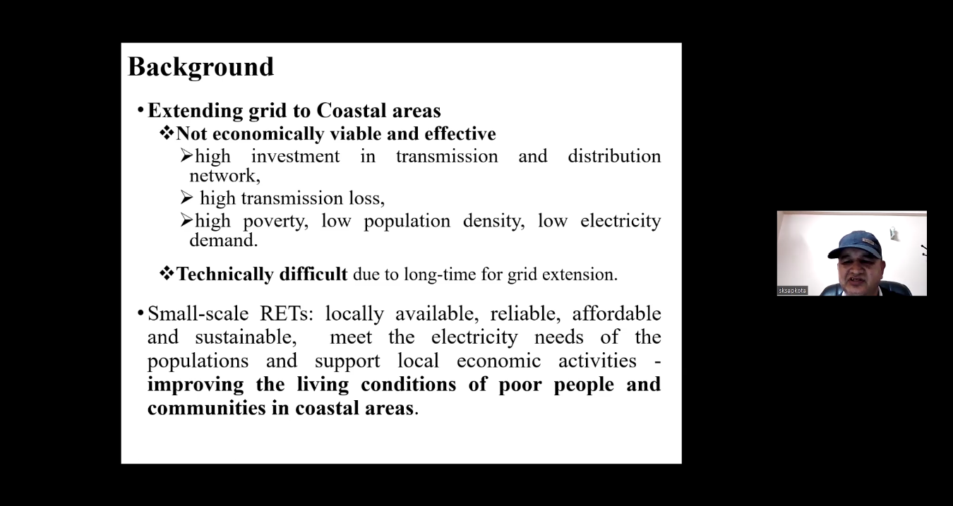 Dr. Sapkota provided a comprehensive analysis of small-scale renewable energy options for electricity supply in coastal areas. Drawing from his expertise in renewable energy policy and planning, he discussed the selection and prioritization of key barriers, conducted techno-economic assessments, and evaluated the sustainability of existing renewable energy systems. His recommendations aimed at promoting accessible and sustainable energy solutions for coastal communities resonated with the session’s overarching goals.