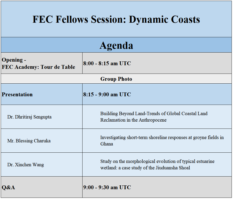 This session will be focused on the FEC theme ‘Dynamic Coasts’. – Coastal systems and regional seas are constantly changing as a result of biophysical and socio-economic activities. In this session, we will focus on synthesizing existing understanding of the changing state of coasts in terms of risks and future trends and discuss the following questions: